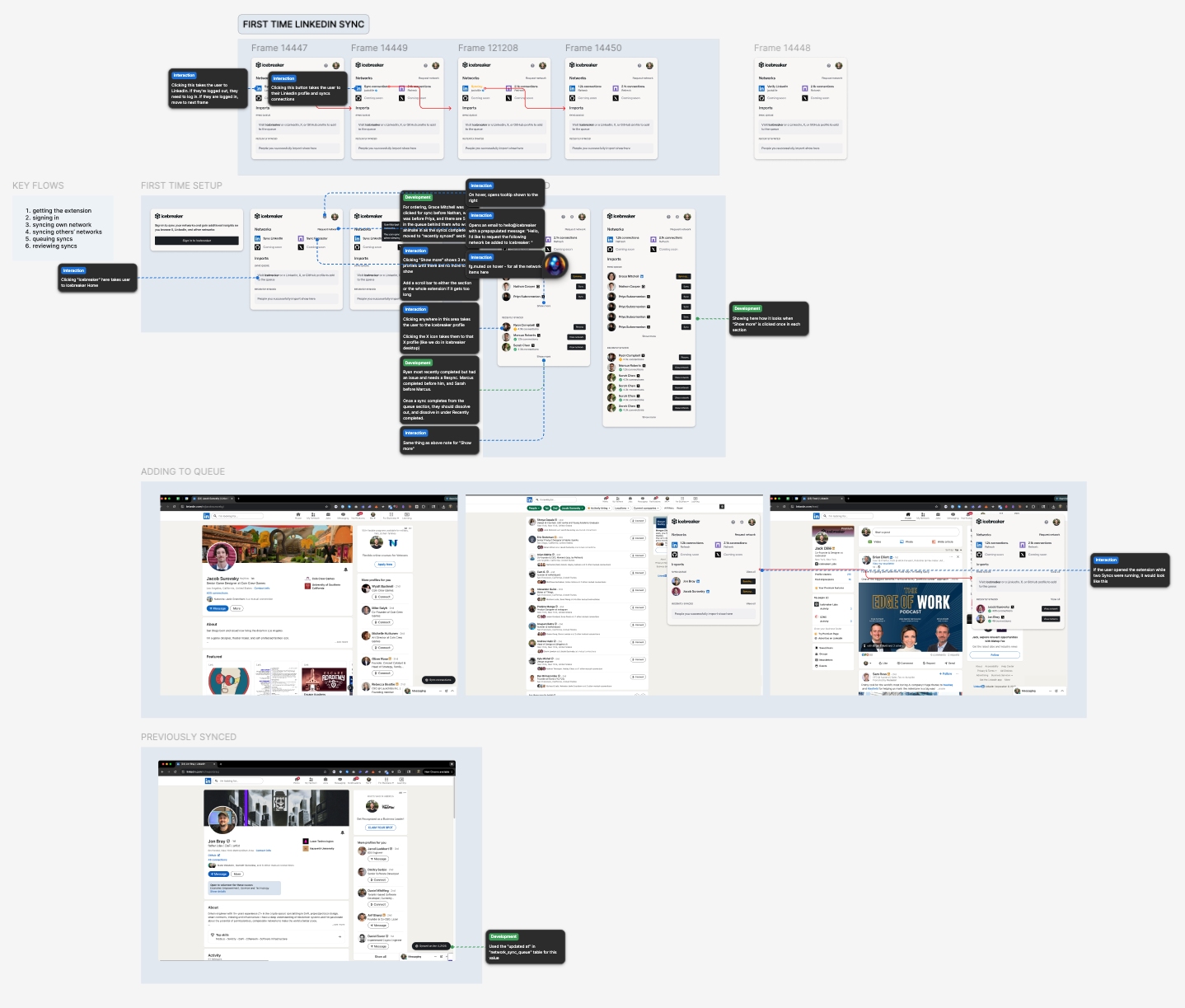I designed the full extension experience: the popup UI, the onboarding flow, queue management, and the button injection on LinkedIn profile pages. Included detailed interaction notes for my developer to ensure the states and edge cases were covered.